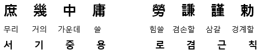 (註) 중용은 치우치거나 기울지 않고 과하거나 모자람이 없는 변하지 않는 평상의 기준이나 이치를 말한다. 사서인 ‘중용’의 저자는 공자의 손자인 자사이다.